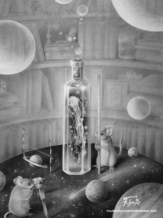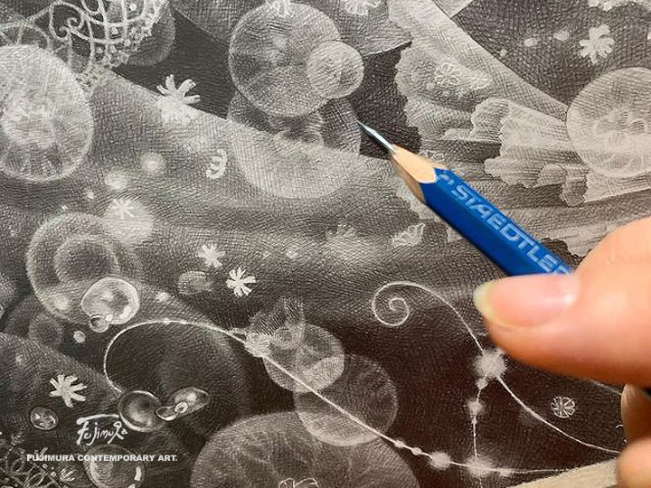 鉛筆というモノクロの世界から溢れだす美しい想像上の色。それは見る者一人一人異なる神秘の世界。